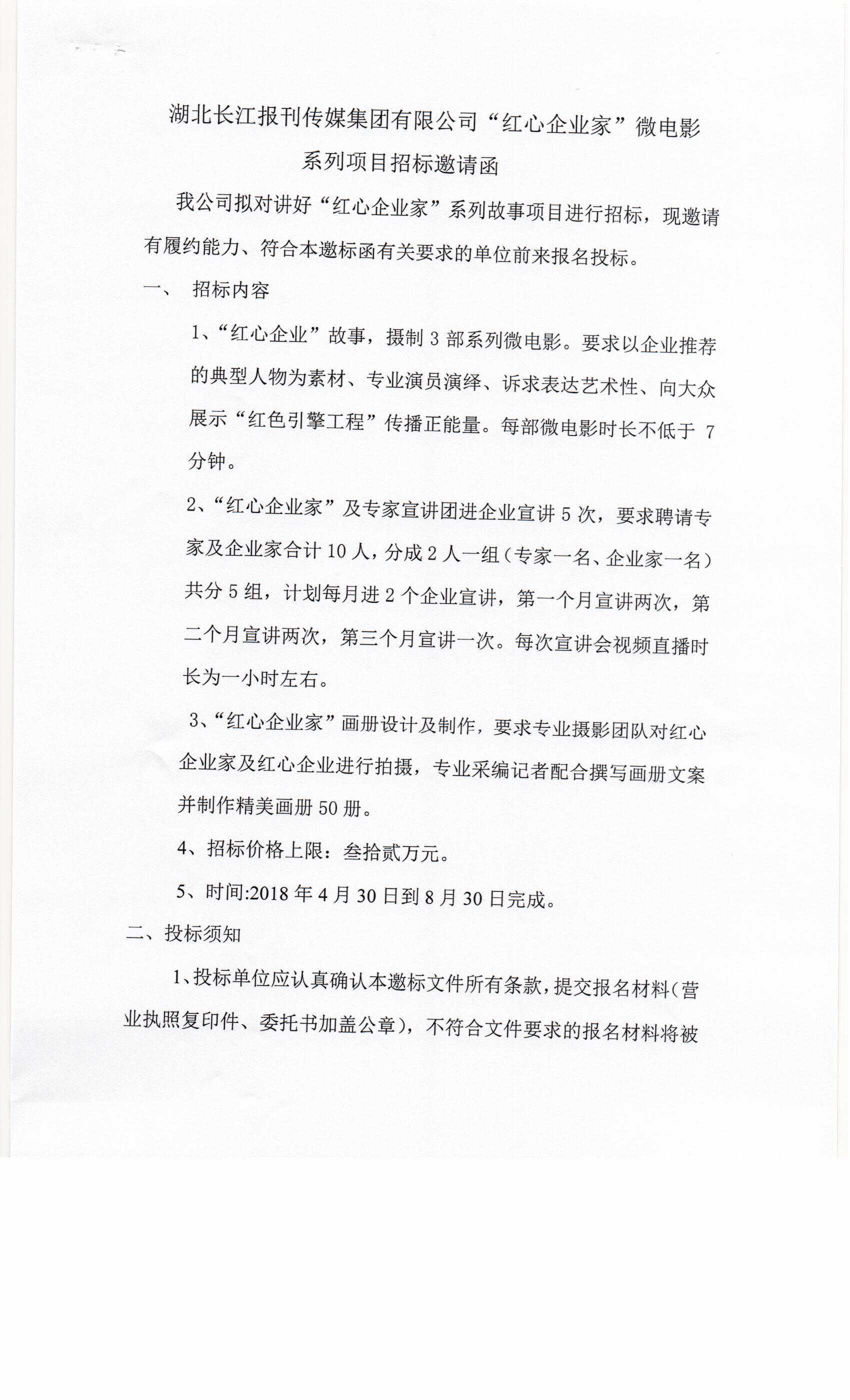 報(bào)刊集團(tuán)“紅心企業(yè)家”微電影系列項(xiàng)目招標(biāo)邀請(qǐng)函及招標(biāo)文件