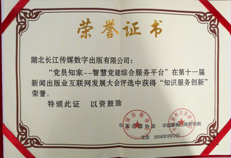 2018年1月12日,第十一屆新聞出版業(yè)互聯(lián)網(wǎng)發(fā)展大會在北京舉行,長江數(shù)字“黨員知家——智慧黨建綜合服務平臺”獲評“知識服務創(chuàng)新”榮譽。“黨員知家——智慧黨建綜合服務平臺”由長江數(shù)字自主研發(fā),是移動互聯(lián)時代背景下,以信息技術(shù)推動黨建工作開展的智慧型學習、管理與服務平臺,包括“黨員知家”智慧黨建網(wǎng)、“黨員知家”移動黨建APP、“黨員知家”微信公眾