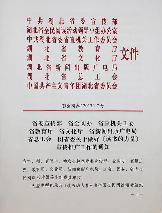 近日,省委宣傳部、省全閱辦、省直機(jī)關(guān)工委、省教育廳、省文化廳、省新聞出版廣電局、省總工會(huì)、共青團(tuán)湖北省委等八大部委聯(lián)合下發(fā)關(guān)于做好《讀書(shū)的力量》宣傳推廣工作的通知。