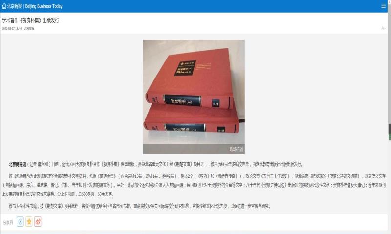 北京商報(bào) | 學(xué)術(shù)著作《賀良樸集》出版發(fā)行