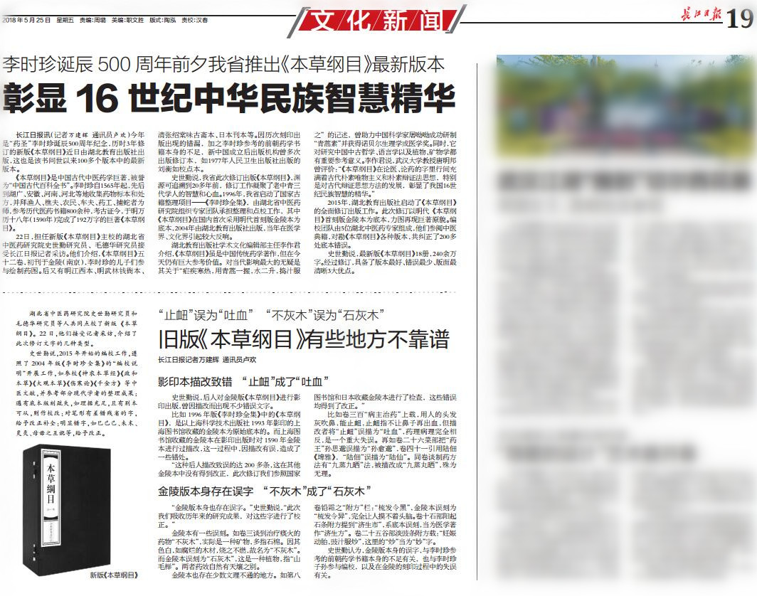 長江日報:李時珍誕辰500周年前夕我省推出《本草綱目》最新版本——彰顯16世紀(jì)中華民族智慧精華