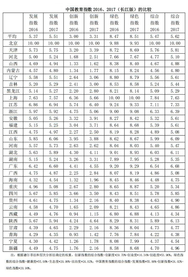 在3月3日上午舉辦的第十一屆北京長(zhǎng)江教育論壇上,長(zhǎng)江教育研究院正式發(fā)布《中國(guó)教育指數(shù)2017》。該研究報(bào)告從規(guī)模、投入、質(zhì)量、信息、公平、貢獻(xiàn)、創(chuàng)新、創(chuàng)業(yè)、創(chuàng)造、健康、生態(tài)、法治等12個(gè)維度反映了2017年全國(guó)及各省(自治區(qū)、直轄市)教育治理能力、改進(jìn)效果以及發(fā)展水平。