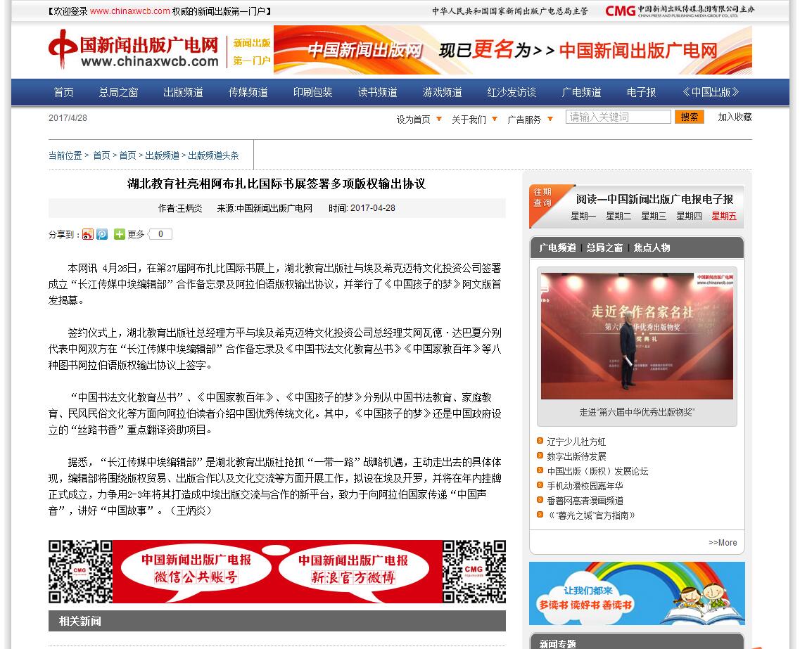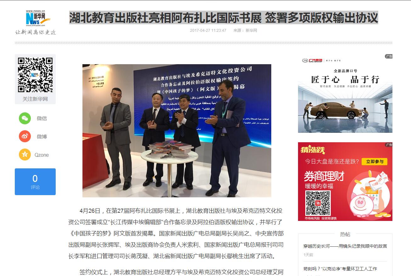 4月26日,在第27屆阿布扎比國際書展上,湖北教育出版社與埃及??诉~特文化投資公司簽署成立“長江傳媒中埃編輯部”合作備忘錄及阿拉伯語版權(quán)輸出協(xié)議,并舉行了《中國孩子的夢》阿文版首發(fā)揭幕。