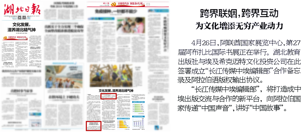 湖北日報頭版點贊湖北教育出版社與埃及希克邁特文化投資公司簽署成立“長江傳媒中埃編輯部”為文化增添無窮產(chǎn)業(yè)動力。