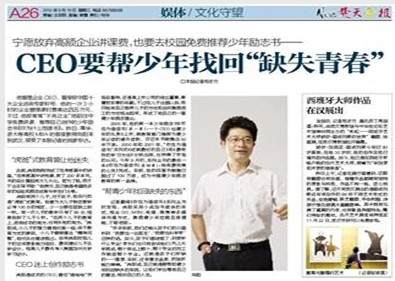 長(zhǎng)江傳媒《湖北楚天金報(bào)專訪長(zhǎng)江社重點(diǎn)書《你在為誰讀書》作者尚陽》的新聞內(nèi)容介紹: 楚天金報(bào)訊 圖為:尚陽 記者鄭志方 他曾是企業(yè)CEO,曾榮獲中國(guó)十大企業(yè)咨詢專家稱號(hào),他的一次3小時(shí)的企業(yè)管理課時(shí)費(fèi)高達(dá)四五萬元,不過,他卻常常不務(wù)正業(yè)地前往中學(xué)免費(fèi)講課,推薦自己創(chuàng)作的少年勵(lì)志書《你為什么而讀書》。昨日,清華、浙大等高校MBA的客座教授尚陽
