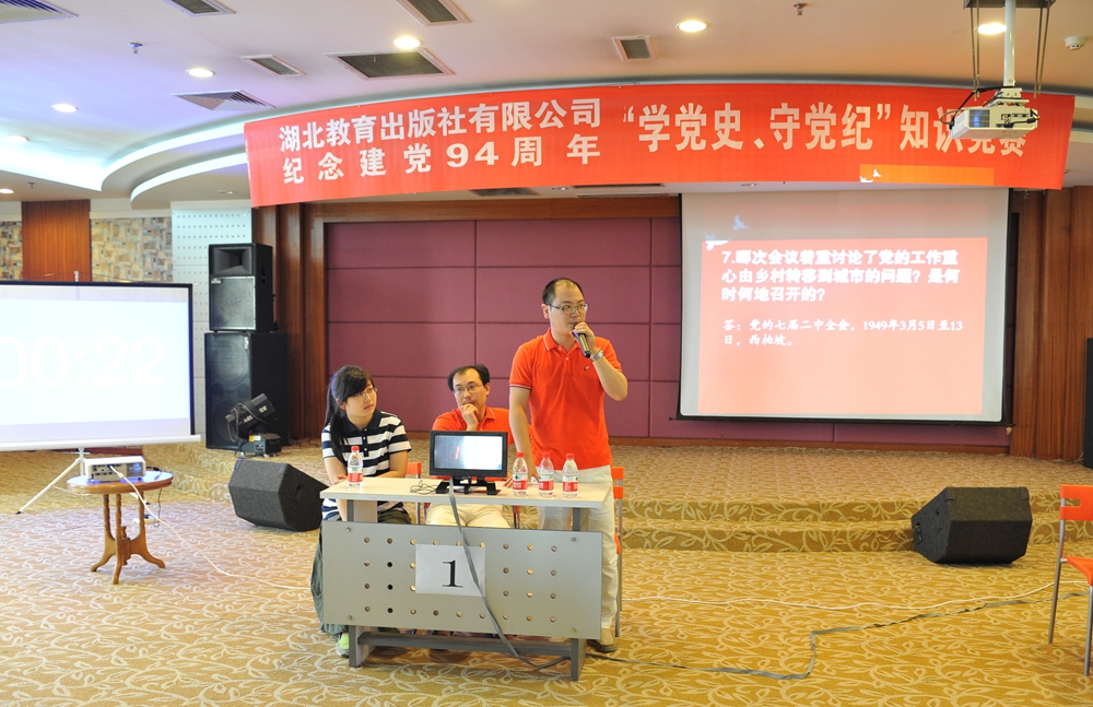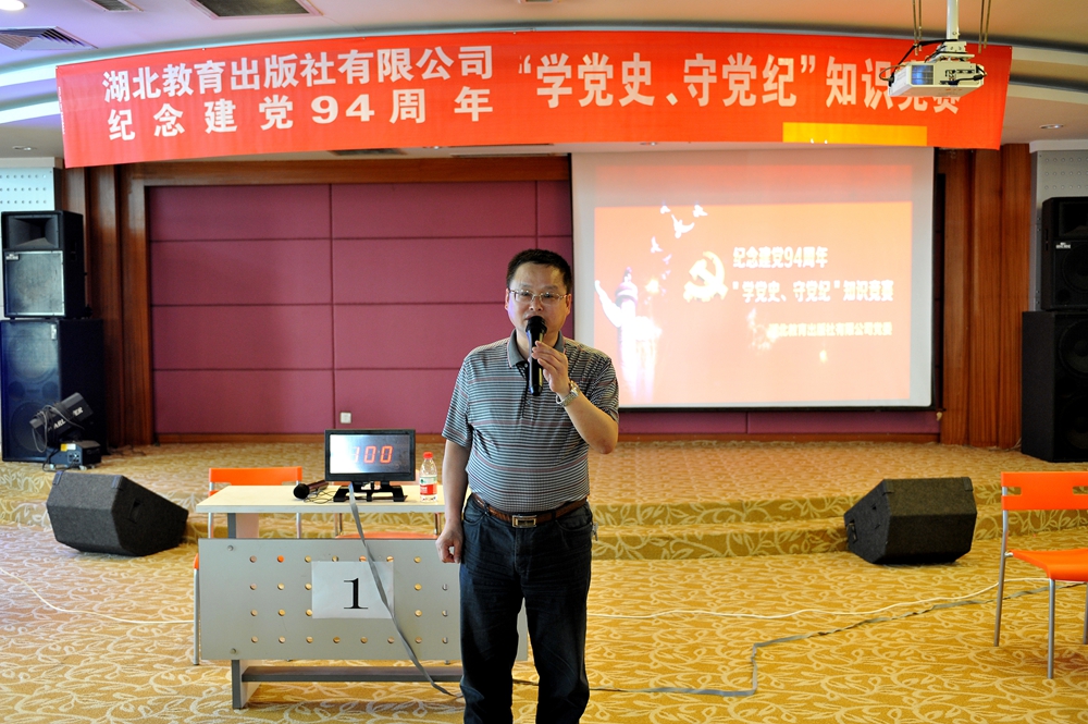 為慶祝中國共產(chǎn)黨建黨94周年,激勵廣大黨員學(xué)習(xí)黨的歷史、黨的知識、黨的理論和黨的革命傳統(tǒng),湖北教育出版社于6月24日舉辦了一場嚴(yán)肅活潑的“學(xué)黨史、守黨紀(jì)”知識競賽活動。教育社黨委委員、副總經(jīng)理趙暉主持活動。全體在職黨員、老干黨支部黨員代表、入黨積極分子及共青團(tuán)員觀看了比賽。