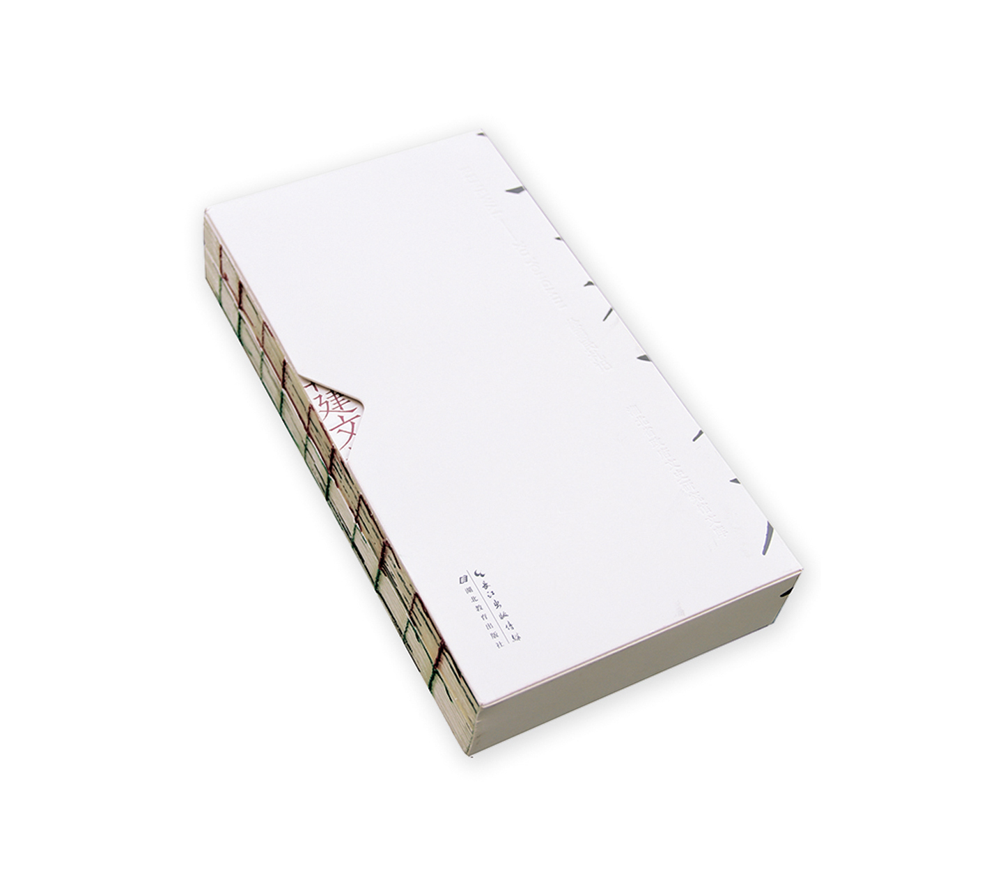 該書由產(chǎn)品設(shè)計(jì)部主任牛紅主持設(shè)計(jì)。據(jù)介紹,書名“再建文檔”四個(gè)字邊緣粗糙,筆畫內(nèi)有白色小點(diǎn)雪花般稀松飄過,放大看更能品味出空靈和野趣;副標(biāo)題中英文書名直接壓凹,更加突出主書名。兩冊(cè)的內(nèi)容色彩比例及節(jié)奏強(qiáng)弱互相呼應(yīng)。裸背裝的棉線采用了最原始的對(duì)比色紅綠來回勾勒,紅綠色也隨意地貫穿在書名、目錄和內(nèi)文及函套中,與圖書風(fēng)格形成統(tǒng)一。選用仿宣紙作為承載作品的介質(zhì),則表達(dá)了一種真實(shí)隨意和舒適自然感。