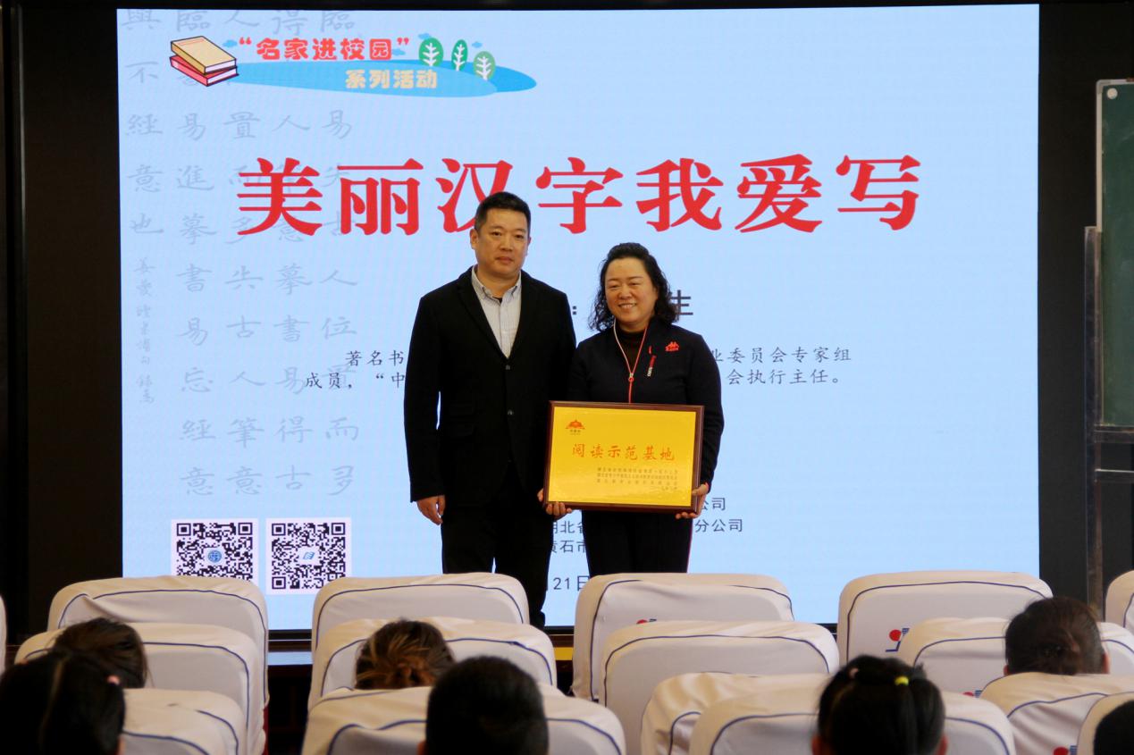 湖北教育出版社副總經(jīng)理曾巍代表湖北省青少年愛國(guó)主義讀書教育活動(dòng)組委會(huì),向黃石市廣場(chǎng)路小學(xué)、武漢市江夏區(qū)明熙小學(xué)授予了“閱讀示范基地”牌匾。