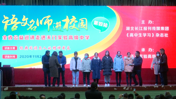 2020年11月26日上午, “語(yǔ)文名師進(jìn)校園”全省公益巡講第四站活動(dòng)在天門實(shí)驗(yàn)高級(jí)中學(xué)舉行。本次活動(dòng)由湖北長(zhǎng)江報(bào)刊傳媒集團(tuán)《高中生學(xué)習(xí)》雜志主辦,天門市教育局協(xié)辦,天門實(shí)驗(yàn)高級(jí)中學(xué)具體承辦。湖北長(zhǎng)江報(bào)刊傳媒集團(tuán)黨委副書(shū)記、總經(jīng)理周發(fā)秋,黨委委員、副總經(jīng)理袁遵敬,主講專家楊邦俊,天門市教育局副局長(zhǎng)彭炎柱,天門市教育局宣教處主任王志仿、魏雙容,天門實(shí)驗(yàn)高級(jí)中學(xué)黨委書(shū)記、校長(zhǎng)劉純紅,副書(shū)記張波濤,副校長(zhǎng)王圣庭,教務(wù)處主任盧政平,《高中生學(xué)習(xí)》雜志執(zhí)行主編劉金華攜編輯團(tuán)隊(duì),《湖北教育》執(zhí)行主編鄢志勇,教育期刊中心營(yíng)銷部經(jīng)理何知怡及天門實(shí)驗(yàn)高級(jí)中學(xué)的高三年級(jí)師生代表共計(jì)1500余人參加本次活動(dòng)。活動(dòng)包括《高中生學(xué)習(xí)》特約編委授聘、天門實(shí)驗(yàn)高級(jí)中學(xué)通訊工作站授牌儀式、雜志捐贈(zèng)和公益講座等環(huán)節(jié)?;顒?dòng)由天門實(shí)驗(yàn)高級(jí)中學(xué)副校長(zhǎng)王圣庭主持。