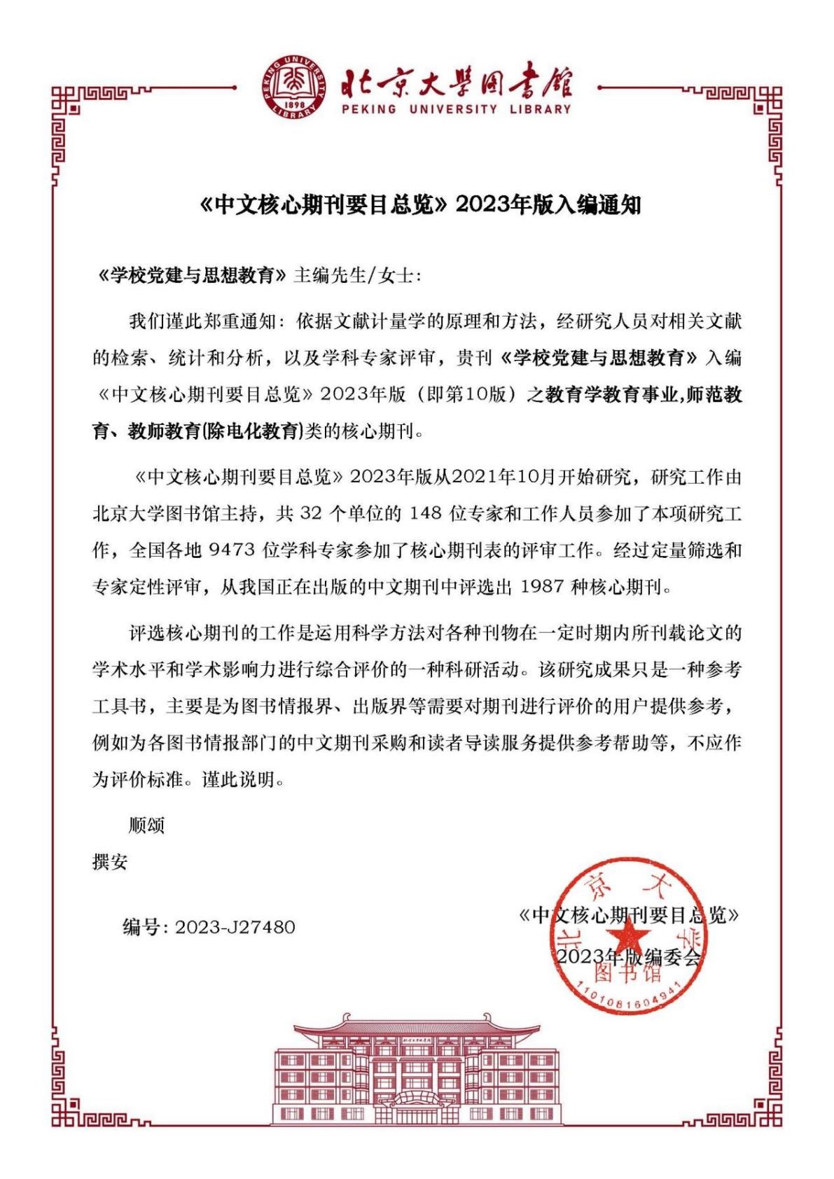 (通訊員 楊曉紅)近日,湖北長(zhǎng)江教育傳媒集團(tuán)有限公司《學(xué)校黨建與思想教育》雜志喜獲《中文核心期刊要目總覽》2023年版編委會(huì)通知,再次入編《中文核心期刊要目總覽》2023年版(即第10版)之教育學(xué)教育事業(yè),師范教育、教師教育(除電化教育)類的核心期刊。這是《學(xué)校黨建與思想教育》自2004年入編《中文核心期刊要目總覽》以來,連續(xù)第七次入編。