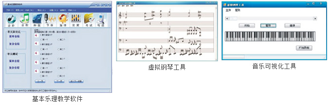 在國家科技支撐計(jì)劃課題《音樂數(shù)字化集成服務(wù)示范》的支持下,相繼開發(fā)了基本樂理教學(xué)軟件、虛擬鋼琴工具與音樂可視化工具。集成了教與學(xué)的諸多元素,實(shí)現(xiàn)了實(shí)時(shí)音樂教學(xué)、音樂彈奏與錄制、實(shí)時(shí)打譜等多項(xiàng)功能,極大地豐富傳統(tǒng)音樂教學(xué)手段。