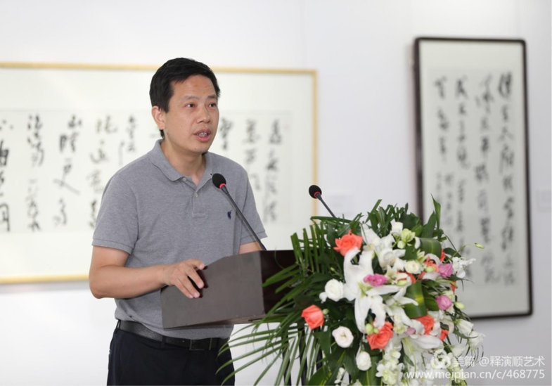 我感到非常的榮幸!今天是虞立新先生的墨韻禪心書法展。我其實是不請自來的,作為一個從事書法相關工作,但是對于書法又是一個外行的學生的身份。我很早就認識虞立新先生,他身上有一個很寶貴的品質(zhì)就是“靜”。他能夠沉下來,永遠把自己看的非常的渺小。雖然很早就有成就,但是一直在書法、在中國傳統(tǒng)的繪畫領域,到詩詞的研習創(chuàng)作上,下了很大的工夫。我們經(jīng)常在媒體上能看到很多關于虞立新先生的相關的信息。今天到此,我們不僅是來參觀,更是來見證、收獲。此次展覽的主題是“墨韻禪心”,他作品中的“韻”和“禪”所具有的豐富的藝術感染力,給我們帶來諸多享受和啟發(fā)。最后我代表《書法報》希望能給虞立新先生格外特別的祝福,再一次祝賀虞立新先生的展覽成功,謝謝大家!