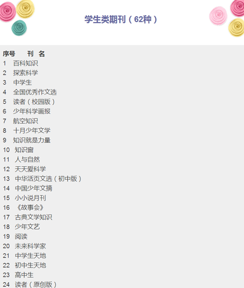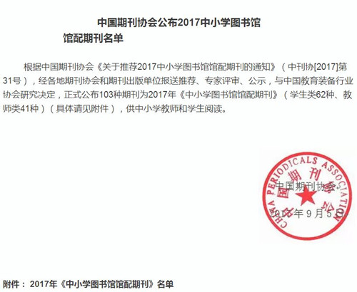 2017年9月5日,根據(jù)中國期刊協(xié)會《關(guān)于推薦2017中小學(xué)圖書館館配期刊的通知》(中刊協(xié)[2017]第31號),經(jīng)各地期刊協(xié)會和期刊出版單位報送推薦、專家評審、公示,與中國教育裝備行業(yè)協(xié)會研究決定,中國期刊協(xié)會正式公布103種期刊為2017年《中小學(xué)圖書館館配期刊》(學(xué)生類62種、教師類41種)(具體目錄附后),《初中生天地》成功入選!