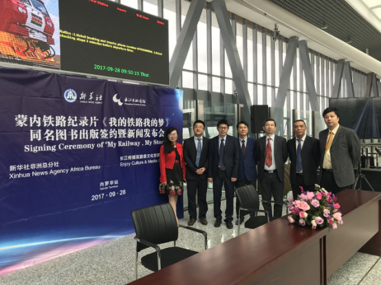 2017年9月28日上午10點(diǎn),新華社非洲總分社與長江傳媒英爵意文化發(fā)展有限公司在蒙內(nèi)鐵路內(nèi)羅畢站聯(lián)合舉行出版簽約儀式暨新聞發(fā)布會(huì),向中外媒體正式宣布,由新華社拍攝的首部蒙內(nèi)鐵路紀(jì)錄片《我的鐵路我的夢(mèng)——中國承建蒙內(nèi)鐵路紀(jì)實(shí)》將推出同名圖書,以中、英、法三種語言分別出版。