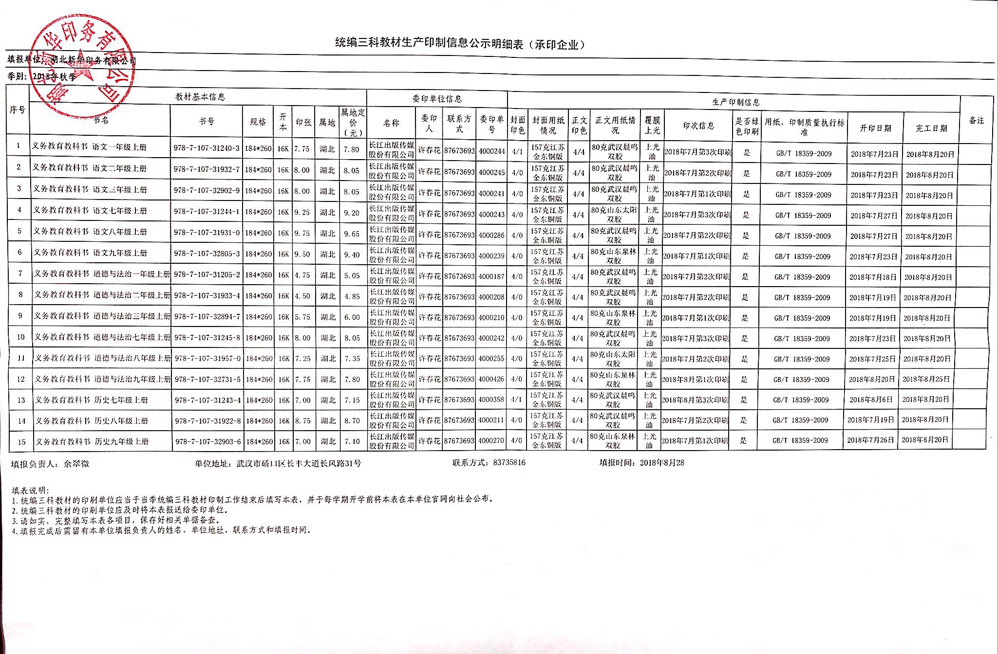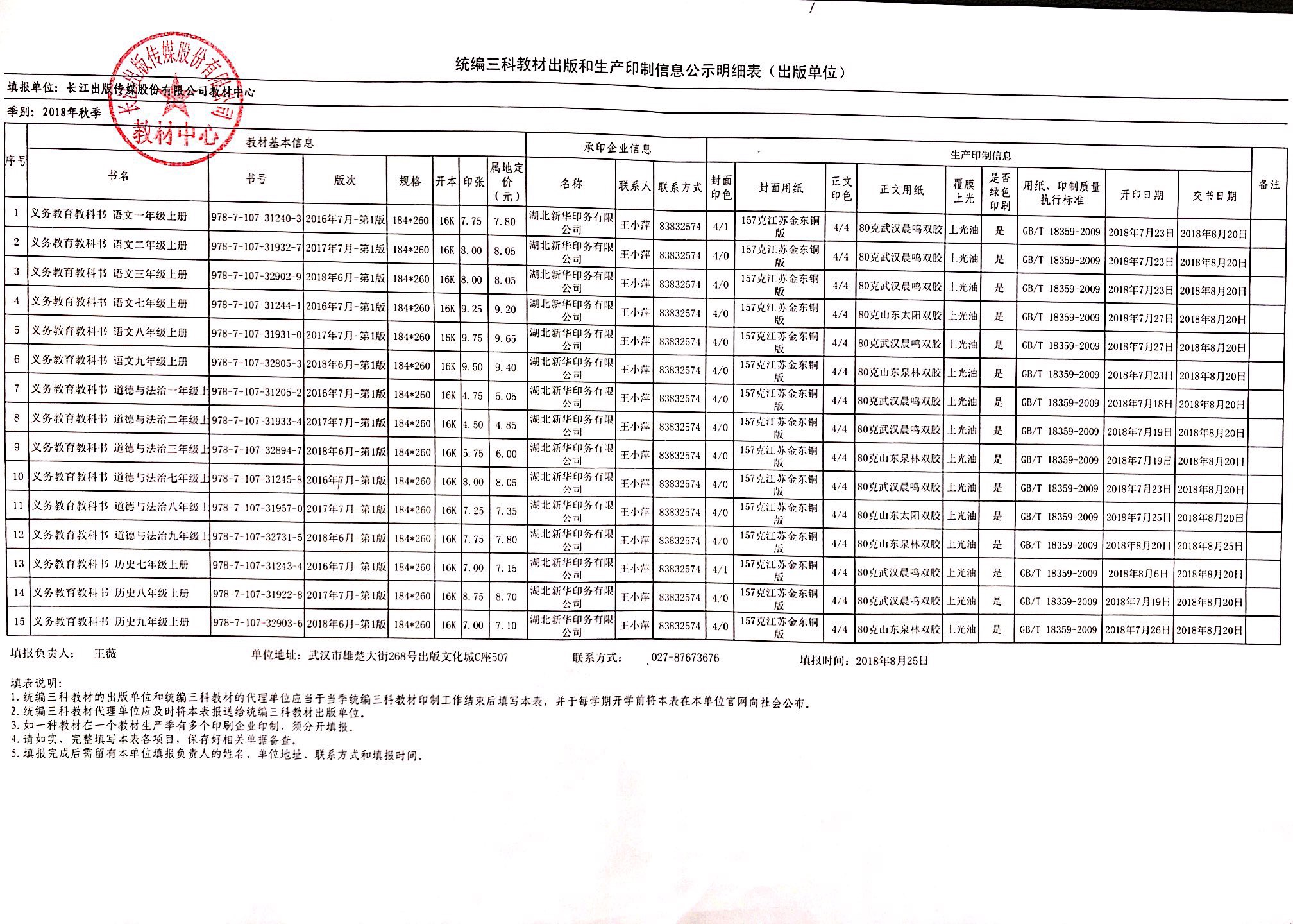 2018年秋季湖北省統(tǒng)編三科教材出版及生產(chǎn)印制信息公示