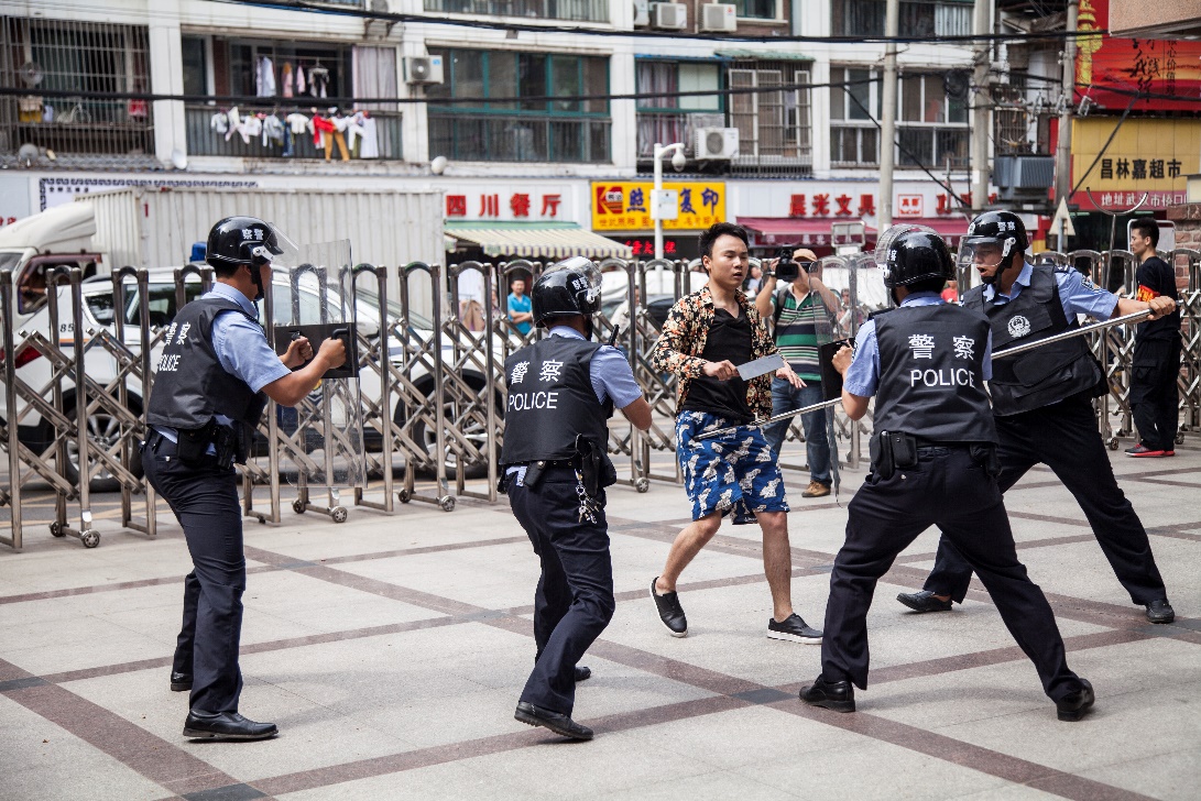 民警演示如何利用防爆盾和鋼叉制服歹徒