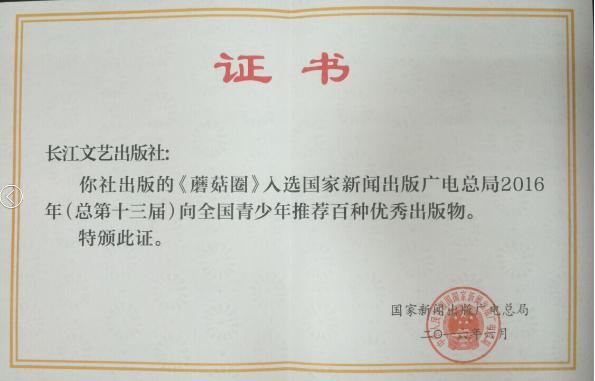 2016年7月5日,國家新聞出版廣電總局在京召開新聞發(fā)布會(huì),發(fā)布2016年向全國青少年推薦百種優(yōu)秀出版物入選書目,長江文藝出版社出版的圖書《蘑菇圈》入選。