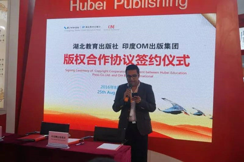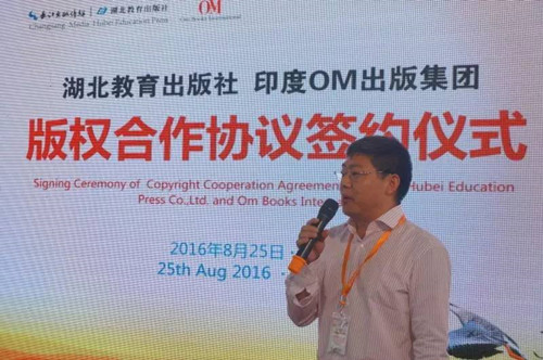 簽約儀式后,印度OM出版集團總經(jīng)理Ajay Mago作了講話,他高度評價與湖北教育出版社之間的合作。在他看來,此次合作體現(xiàn)了中印兩個文明古國間的深厚友誼,加深了兩國間文化合作與交流。隨后,長江出版?zhèn)髅焦煞萦邢薰靖笨偨?jīng)理、董事會秘書萬智發(fā)表講話,指出此次雙方達成版權(quán)合作協(xié)議,是湖北教育出版社深化“一帶一路”的重要舉措,是湖北出版“走出去”的又一次成功嘗試,展現(xiàn)了湖北教育出版社的蓬勃生命力和巨大潛力。
