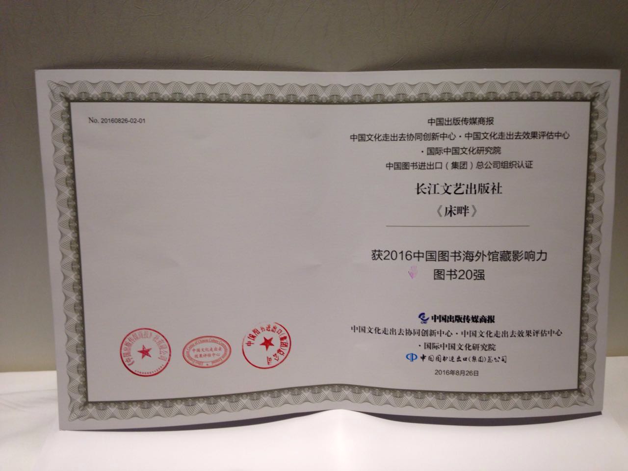 2016年8月26日上午,在2016中國(guó)圖書(shū)海外館藏影響力報(bào)告發(fā)布禮上,長(zhǎng)江文藝出版社榮獲2016中國(guó)圖書(shū)海外館藏影響力出版50強(qiáng)。