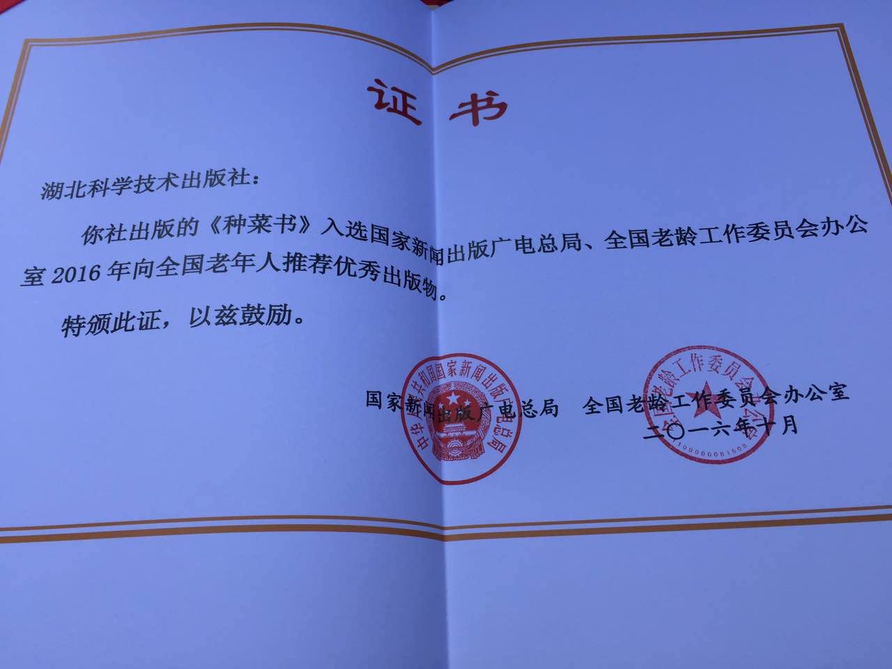 10月9日正值重陽(yáng)佳節(jié),北京市東城區(qū)老年大學(xué)里,由國(guó)家新聞出版廣電總局和全國(guó)老齡工作委員會(huì)辦公室聯(lián)合向全國(guó)老年人推薦的50種優(yōu)秀出版物書目在此間揭曉。其中,文化類圖書13種,文藝類圖書10種,健康類圖書10種,生活類圖書12種,以及音像電子出版物5種。湖北科技社出版的《種菜書》作為生活類圖書入選。