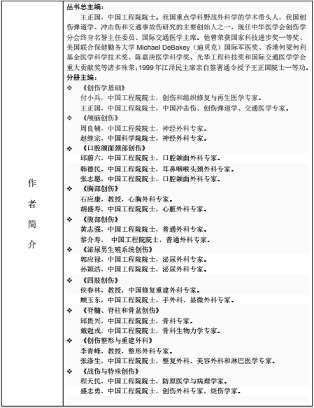 叢書(shū)總主編由王正國(guó)院士擔(dān)任,王正國(guó)院士是我國(guó)重點(diǎn)學(xué)科野戰(zhàn)外科學(xué)的學(xué)術(shù)帶頭人,我國(guó)創(chuàng)傷彈道學(xué)、沖擊傷和交通事故傷研究的主要?jiǎng)?chuàng)始人之一,現(xiàn)任中華醫(yī)學(xué)會(huì)創(chuàng)傷學(xué)分會(huì)終身名譽(yù)主任委員、國(guó)際交通醫(yī)學(xué)主席。他曾榮獲國(guó)家科技進(jìn)步獎(jiǎng)一等獎(jiǎng)、美國(guó)聯(lián)合保健勤務(wù)大學(xué)Michael DeBakey(迪貝克)國(guó)際軍醫(yī)獎(jiǎng)、香港何梁何利基金醫(yī)學(xué)科學(xué)技術(shù)獎(jiǎng)、陳嘉庚醫(yī)學(xué)科學(xué)獎(jiǎng)、光華工程科技獎(jiǎng)和國(guó)際交通醫(yī)學(xué)學(xué)會(huì)重大貢獻(xiàn)獎(jiǎng)等諸多殊榮;1999年江澤民主席親自簽署通令授予王正國(guó)院士一等功。