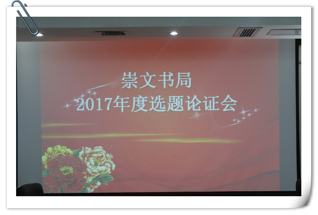 11月24日,崇文書局召開2017年度選題論證會,社領(lǐng)導(dǎo)班子成員、紀檢專員、全體編輯、總編室人員、市場營銷部人員參加了此次論證會。