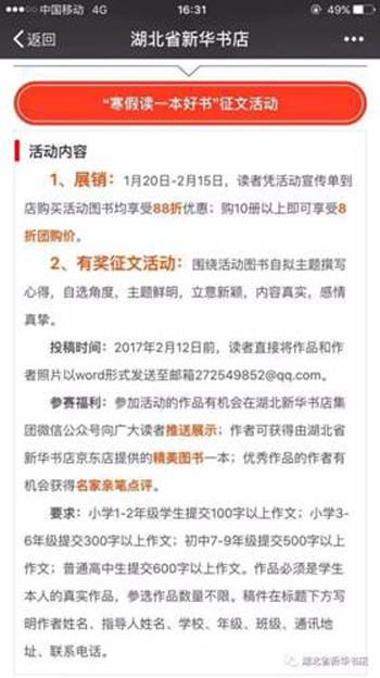 寒假開(kāi)始,新華集團(tuán)“湖北省新華書(shū)店”微信公眾號(hào)推出了“楚天少兒悅讀季——假期讀一本好書(shū)”征文活動(dòng),開(kāi)學(xué)前夕,僅從襄陽(yáng)地區(qū)就征集到51篇征文,各地征文仍在持續(xù)提交,有效助推了開(kāi)學(xué)季營(yíng)銷(xiāo)熱潮。