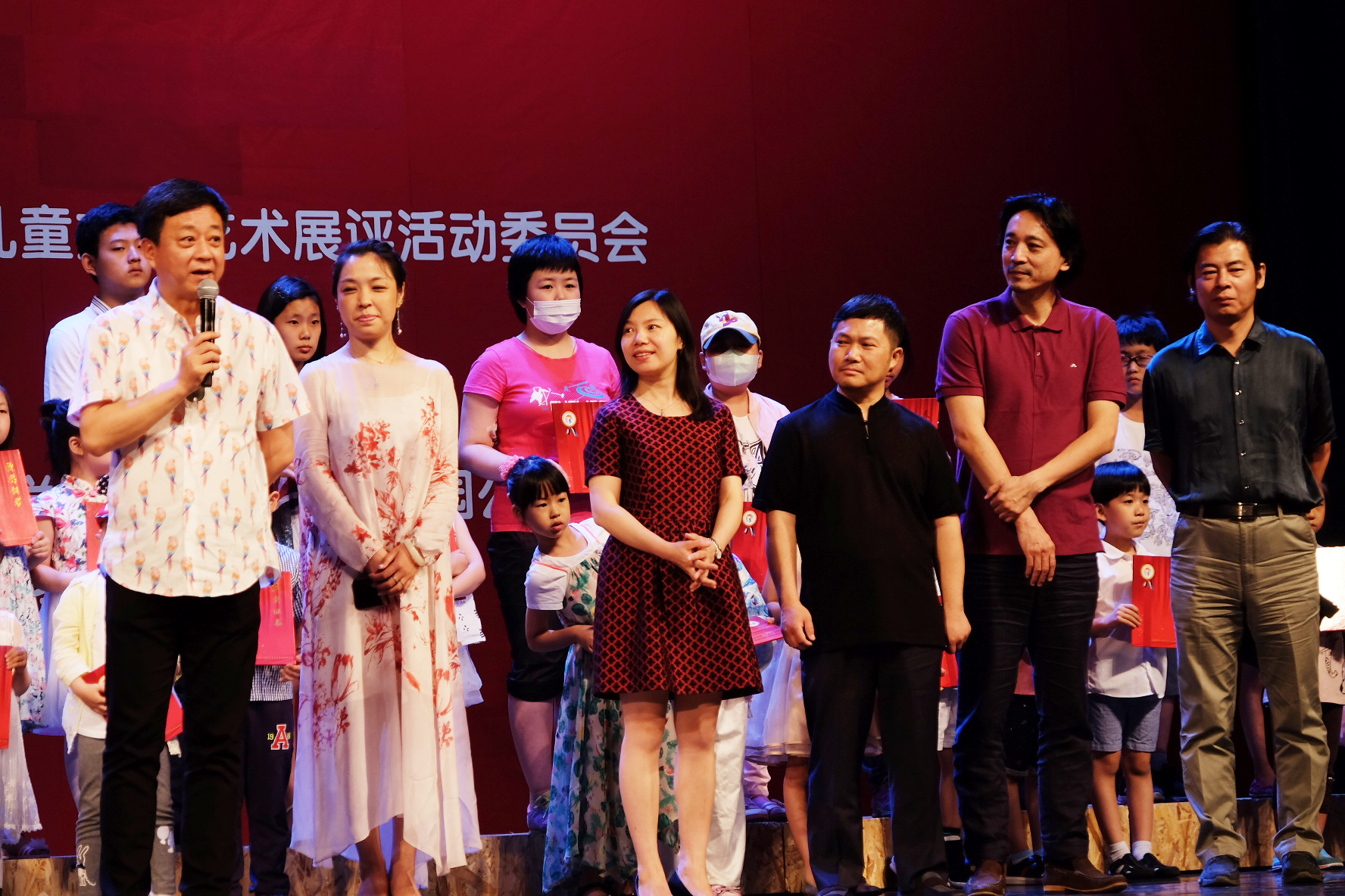 音樂(lè)會(huì)后,少兒美術(shù)展開(kāi)幕,常銳倫教授、謝小銓副館長(zhǎng)、著名主持人朱軍、朱燕紅園長(zhǎng)、馬剛校長(zhǎng)、潘振凱部長(zhǎng)、余杉總編輯、鄭勤硯副教授共同為“少兒美術(shù)學(xué)術(shù)交流展”獲獎(jiǎng)兒童頒獎(jiǎng)。朱軍代表嘉賓致辭,特別談了自己的觀展感受,表達(dá)了對(duì)公益事業(yè)的支持,感謝了中央美術(shù)學(xué)院等機(jī)構(gòu)在美育方面所做的努力。
