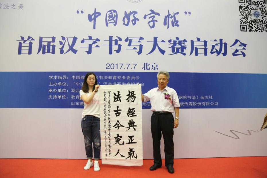 隨后,與會書法家和嘉賓丁永康、李巖選、徐莉、常汝吉、鄭疆、王平和方平向?qū)W生代表贈送了大賽指定用書《中國好字帖》。