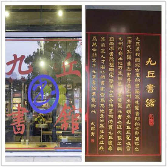 除了“店”與“館”的轉(zhuǎn)變,九丘書(shū)館在內(nèi)部裝飾上也著實(shí)花了心思,湖北省非物質(zhì)文化遺產(chǎn)南漳剪紙第三代傳承人李秀琳專門(mén)設(shè)計(jì)了“九丘書(shū)館”窗貼;書(shū)館在顯目位置懸掛九丘名牌,將書(shū)館取名寓意——希冀荊楚人才潛心讀書(shū)求索,為天地立心、為生民立命、為萬(wàn)世開(kāi)太平——展示于人,而名牌上“九丘書(shū)館”四個(gè)隸書(shū)大字則由襄陽(yáng)知名書(shū)法家、書(shū)法理論家王太雄撰寫(xiě)。