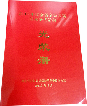 根據(jù)《關(guān)于在全省開展全民閱讀爭先創(chuàng)優(yōu)活動的通知》(鄂全閱辦[2012]18號)文件要求,經(jīng)省全民閱讀活動小組相關(guān)成員單位和各市州全民閱讀活動領(lǐng)導(dǎo)小組辦公室組織推薦,活動評審委員會評審,在4月23日湖北省全民閱讀活動月啟動儀式上,全民閱讀活動領(lǐng)導(dǎo)小組公布了2012年度全省全民閱讀創(chuàng)先爭優(yōu)活動獲獎名單。