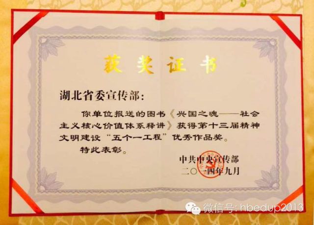 2014年9月13日,在北京京西賓館召開的第十三屆精神文明建設(shè)"五個一工程"獎表彰座談會上,湖北教育出版社《興國之魂——社會主義核心價(jià)值體系釋講》獲獎并榮登圖書類榜首。中共中央政治局委員、中央書記處書記、中宣部部長劉奇葆出席并講話。湖北省委常委、宣傳部長尹漢寧、文藝處處長杜海波、湖北教育出版社社長方平等領(lǐng)導(dǎo)同志參加了會議。