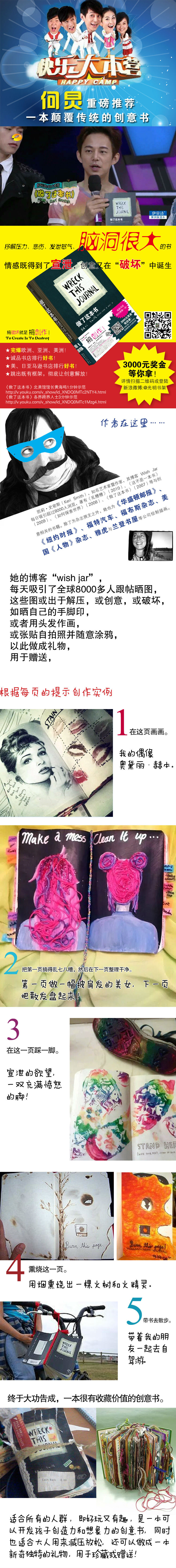 據(jù)悉,《做了這本書(shū)》不同于一般圖書(shū),它顛覆一般傳統(tǒng)書(shū)籍的格式,每頁(yè)以不同的指示文字及插圖,引導(dǎo)讀者大膽搞亂,放肆涂寫(xiě),突破局限,讓每個(gè)人內(nèi)在的創(chuàng)意真正獲得完全解放。讀者可以在頁(yè)面上穿洞、剪下來(lái)穿成環(huán)、用針線縫起來(lái)、涂上膠水、貼上回形針、滴上咖啡、帶書(shū)去散步、紀(jì)錄晚餐的食物……作者希望借由這些大部分人從來(lái)不會(huì)對(duì)書(shū)做的事,讓讀者親身體驗(yàn)發(fā)想創(chuàng)意的過(guò)程,鼓勵(lì)讀者以全新的角度來(lái)看待事物,找到新的方式發(fā)揮想象力,真正享受藝術(shù)創(chuàng)作的樂(lè)趣。而借由一些看似“破壞”的動(dòng)作,作者也鼓勵(lì)讀者,突破自我,走出框架,無(wú)拘無(wú)束大膽勇敢嘗試,體驗(yàn)生命的各種可能性。