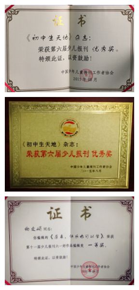 《初中生天地》創(chuàng)刊9年來(lái)收獲了多個(gè)國(guó)家級(jí)以及省級(jí)大獎(jiǎng)。其中2010年、2012年、2014年連續(xù)三屆榮獲“湖北省優(yōu)秀期刊獎(jiǎng)”,2013年、2015年連續(xù)兩屆榮獲“全國(guó)少兒報(bào)刊優(yōu)秀獎(jiǎng)”。