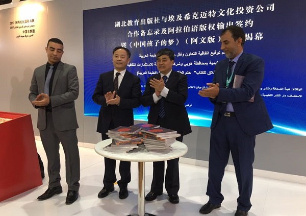 4月26日,在第27屆阿布扎比國(guó)際書(shū)展上,湖北教育出版社與埃及??诉~特文化投資公司簽署成立“長(zhǎng)江傳媒中埃編輯部”合作備忘錄及阿拉伯語(yǔ)版權(quán)輸出協(xié)議,并舉行了《中國(guó)孩子的夢(mèng)》阿文版首發(fā)揭幕。國(guó)家新聞出版廣電總局副局長(zhǎng)吳尚之、中央宣傳部出版局副局長(zhǎng)張擁軍、埃及出版商協(xié)會(huì)負(fù)責(zé)人米索利、國(guó)家新聞出版廣電總局報(bào)刊司司長(zhǎng)李軍和進(jìn)口管理司司長(zhǎng)蔣茂凝、湖北省新聞出版廣電局副局長(zhǎng)鄢桃生出席了活動(dòng)。