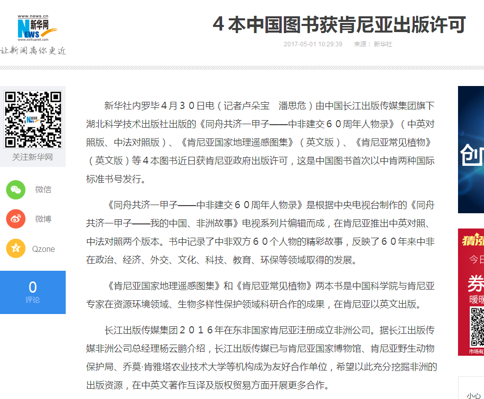 日前,湖北科學技術(shù)出版社出版的《同舟共濟一甲子——中非建交60周年人物錄》(中英對照版、中法對照版)等4本圖書近日獲肯尼亞政府出版許可受到多家媒體的關(guān)注,人民日報、新華社、中國日報、湖北日報等多家媒體先后進行了報道和轉(zhuǎn)載。這是中國圖書首次以中肯兩種國際標準書號發(fā)行。