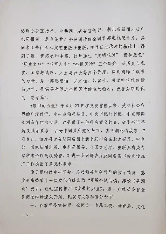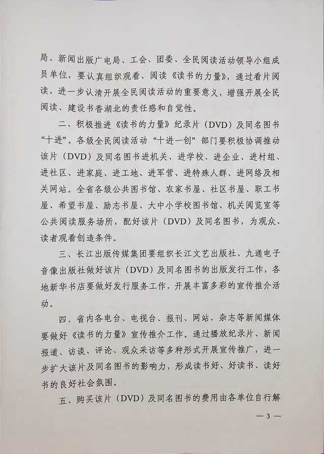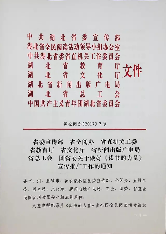 中共湖北省委宣傳部、湖北省全民閱讀活動領(lǐng)導(dǎo)小組辦公室、中共湖北省委省直機關(guān)工作委員會、湖北省教育廳、湖北省文化廳、湖北省新聞出版廣電局、湖北省總工會、中國共產(chǎn)主義青年團湖北省委員會聯(lián)合下發(fā)關(guān)于做好《讀書的力量》宣傳推廣工作的通知。