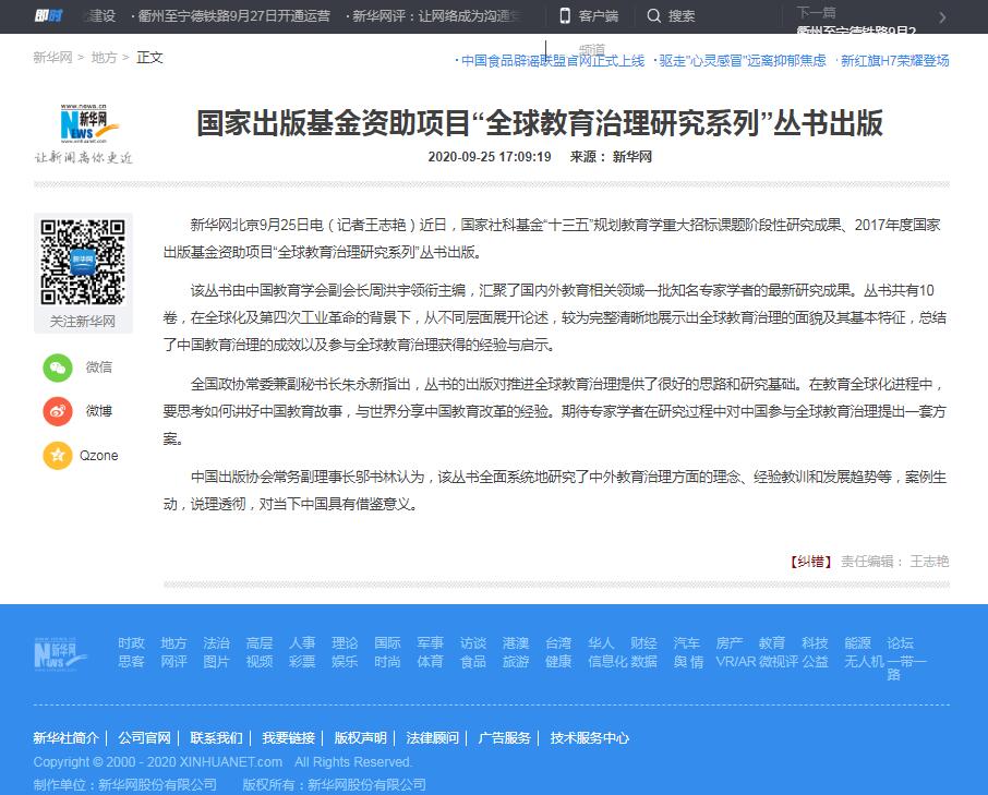 新華網(wǎng)北京9月25日電(記者王志艷)近日,國(guó)家社科基金“十三五”規(guī)劃教育學(xué)重大招標(biāo)課題階段性研究成果、2017年度國(guó)家出版基金資助項(xiàng)目“全球教育治理研究系列”叢書出版。