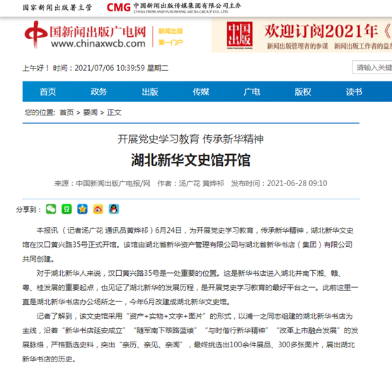 本報(bào)訊 (記者湯廣花 通訊員黃燁祁)6月24日,為開(kāi)展黨史學(xué)習(xí)教育,傳承新華精神,湖北新華文史館在漢口黃興路35號(hào)正式開(kāi)館。該館由湖北省新華資產(chǎn)管理有限公司與湖北省新華書店(集團(tuán))有限公司共同創(chuàng)建。