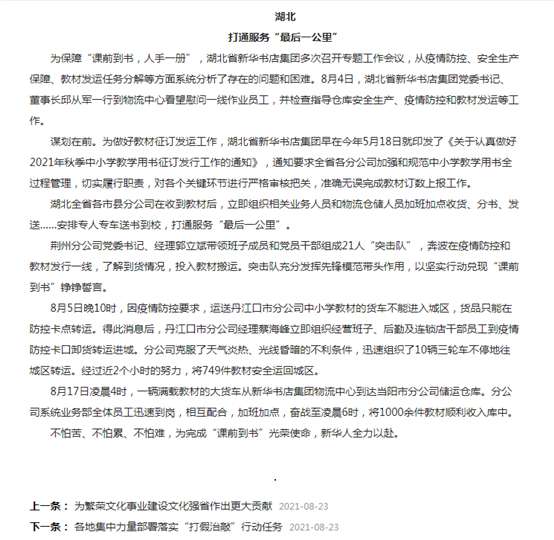 湖北全省各市縣分公司在收到教材后,立即組織相關(guān)業(yè)務(wù)人員和物流倉儲(chǔ)人員加班加點(diǎn)收貨、分書、發(fā)送……安排專人專車送書到校,打通服務(wù)“最后一公里”。